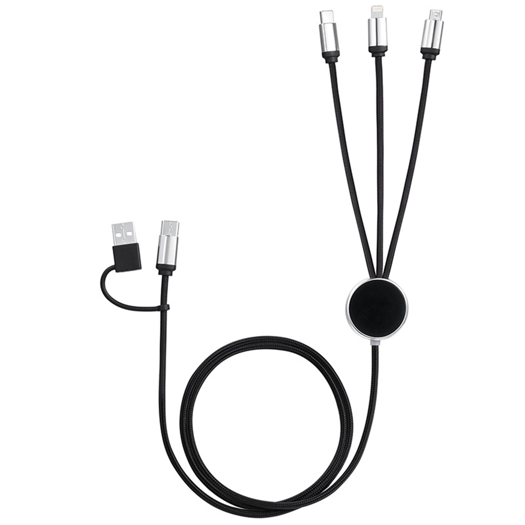 Showcase your brand with the eye-catching Multi-Cable, featuring a built-in LED-lit logo. Designed with USB-C, 8-pin, and micro USB outputs, it offers versatile compatibility for all your devices. Enjoy effortless charging with an end-to-end reach of nearly 47.2 inches—just plug into any USB power source and connect to your smartphone or device. Note: Laser engraving is required to activate the LED logo lighting feature. Light color: white.